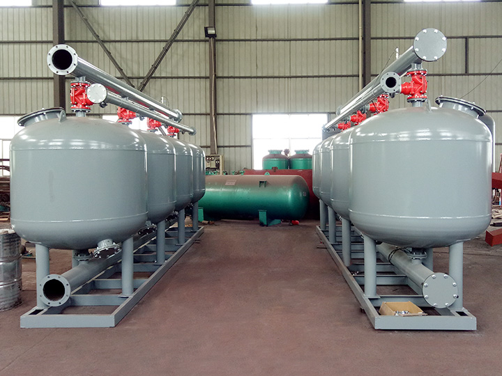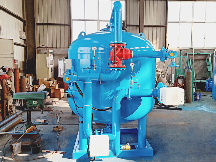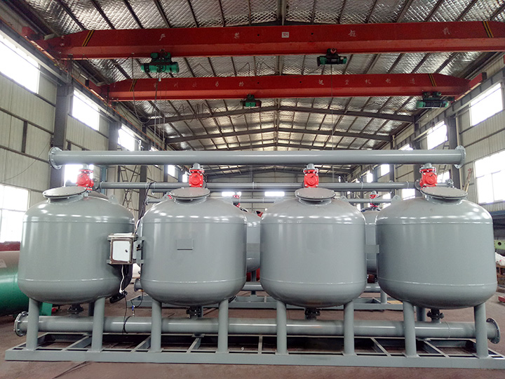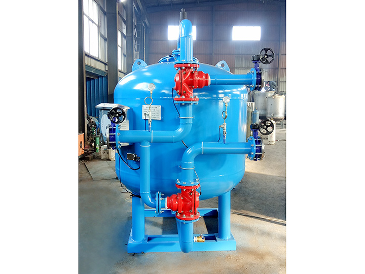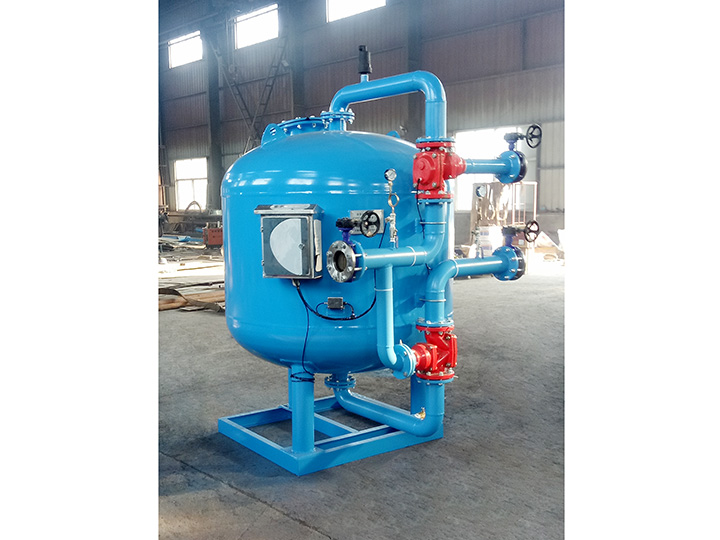 當系統處于反洗狀態時,過濾仍然繼續,其中要進行反洗的標準單元砂缸不進行過濾,系統中其它標準單元砂缸仍然在過濾。過濾后的清潔水部分用來反洗標準單元砂缸,其余仍送到用戶處。反沖洗污水則通過水力閥的反洗排水口被排出。在高速砂缸全自動過濾系統中,特殊的集水器設計可使填料之間填料相互搓洗,提高反沖洗效率,減少所需的反洗水(清潔水),同時反洗時沒有跑料現象。一個標準單元砂缸反洗為2分鐘,反沖洗結束,標準單元砂缸內部壓頭損失減小到合理范圍,定壓裝置給出復原信號,水力閥恢復到過濾狀態,下一個標準單元砂缸則準備進入反洗狀態。